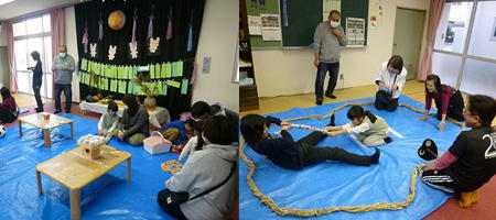 ミニトマトがいっぱいできることを願って相撲をしました。引っ張り相撲は熱い戦いの連続で、非常に盛り上がりました。